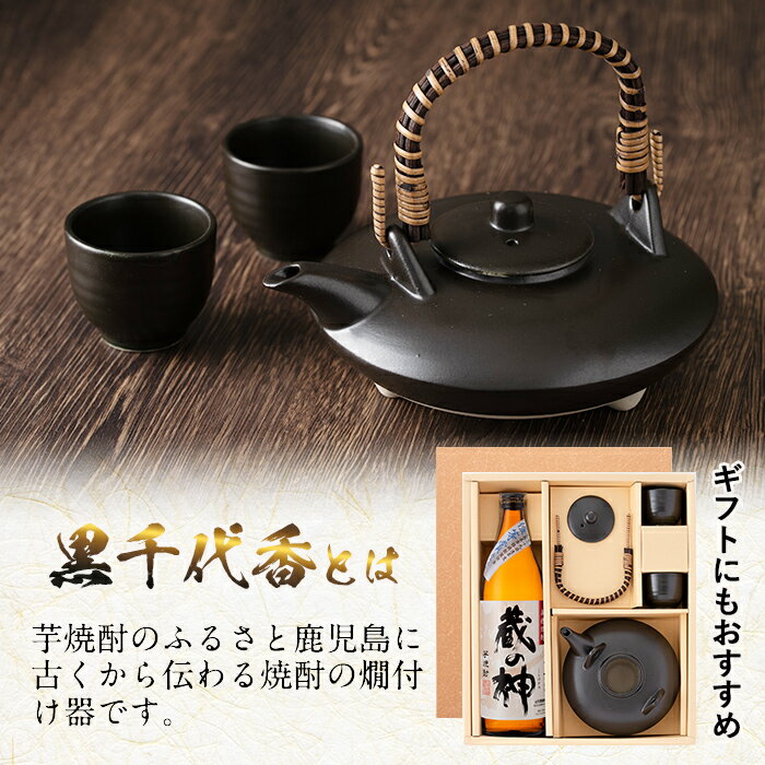 商品情報 商品名 蔵の神 黒ぢょかセット 原材料名 さつまいも・米麹 内容量 蔵の神:900ml 黒ぢょか:1個 猪口:2個 賞味期限 1年以上 保存方法 直射日光、高温多湿を避け常温 製造者 山元酒造株式会社鹿児島県薩摩川内市 商品説明 焼酎の本場、鹿児島の粋な飲み方=黒ぢょかで焼酎一献しませんか? 焼酎は前割りがオススメ。
