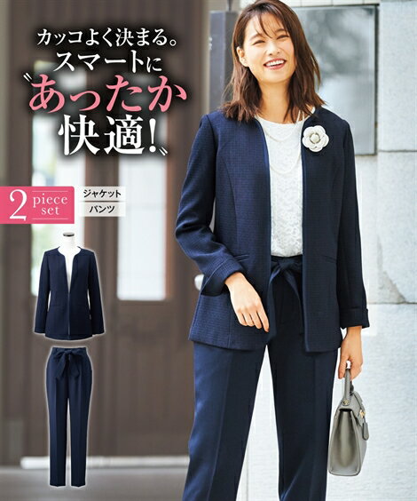 スーツ セレモニー レディース 着膨れ知らず あったか 裏地付 ツイード調 ノーカラージャケット パンツ 蓄熱裏地使用 入園 入学 卒園 卒業 冬 フォーマル ネイビー系+ネイビー LL/3L ニッセン nissen
